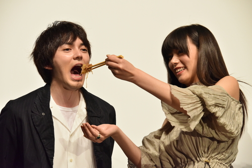 映画の内容にちなんで池田さん手作りの肉じゃがを林さんにファーストイーティングする企画が! 池田さんから「あ~ん」された林さんは大きな口を開けて幸せそう。羨ましすぎる~!! 林さん:女性から食べさせてもらったのは生まれて初めて。美味しい!映画の中では役としてエライザさんに食べさせてもらったけれど、今日は本人同士で食べさせてもらって、こっちの方が嬉しいです!!!! と封印したはずの役柄同様のオーラを醸し出して、池田さんを怯えさせました(笑)。 |