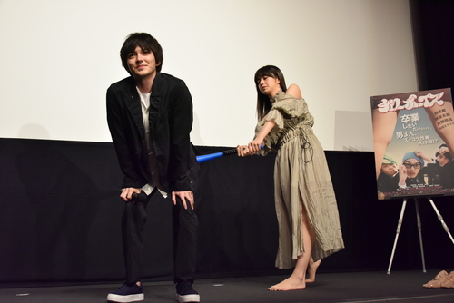 初日にもかかわらず緩み切った童貞トリオに、池田さんがケツバットをすることに!! 青いバットで栁さんの尻をパーンと池田さん。 次に「マジでフルスイングで!」と懇願する前野さんの願いを叶えるべく、高いヒールを脱ぎ捨てて思い切り振りスパーン!!!! そしてトリを務める林さんは・・・ 林さん:ヒットではなく、ホームランでお願いします!!! スドン!と池田のフルスイングを尻で受け止めていました! 男性3人のお尻を射抜いて 池田さん:スカッとしました!取材に来ていただいたライターさんたちが効果音でどうやって表現するのか楽しみ! と。 最後に・・・ 林さん:こんなに楽しいと思えた舞台挨拶はなくて、幸せな一日でした。色々と騒ぎましたが、撮影現場ではみんなで作品に愛情を注いで大事に作りました。関わって良かったと思える作品なので、公開を楽しみにしていました!皆さんもこれから帰って平昌五輪のニュースを見るのもいいですが、この作品をもう一度観に来てもらえるのも嬉しいです! とイベントを締めました。 |