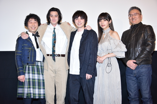 その初日を祝し舞台挨拶が行われ、主演の林遣都、共演の栁俊太郎、前野朋哉、池田エライザ、西海謙一郎監督が登壇しました! 映画『チェリーボーイズ』初日舞台挨拶 |
