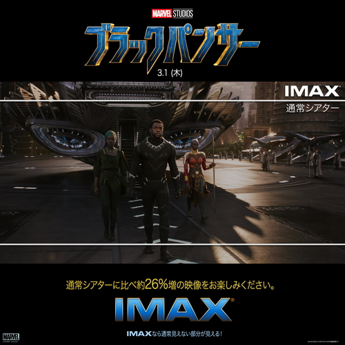 『ブラックパンサー』では、いくつかのシーンにおいて、IMAX®シアター仕様に特別フォーマットされ、本編の少なくとも約50分間がIMAX画角1:9:1に拡がり、スクリーンのより広い範囲を埋め尽くし、通常シアターに比べ約26%増の映像を楽しむことができる。