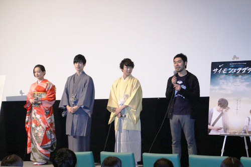 阪本さんのふんどし姿での感謝の気持ち 阪本さん:今日ほんとに公開出来て、このような沢山のお客さもに来ていただいて幸せでした。しあわせでした。撮影では監督、須賀さん、間宮さんたちに助けていただいて乗り切り、大切な作品になりました。これを今後色々な人に見ていただけるよう頑張っていきます。
