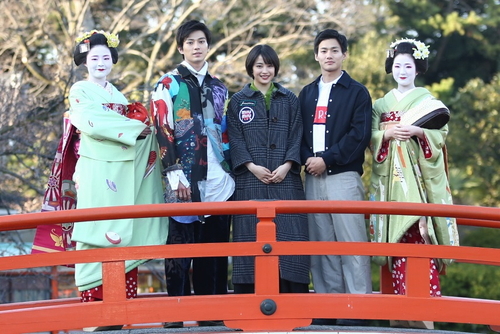 映画情報どっとこむ ralph 2か所目の京都では、“お花見発祥の地”としても知られる、神泉苑(京都市中京区)に参拝。お出迎えした舞妓さん2人と記念撮影を行い、3人で“願いが叶う”と言われている「法成橋」を渡り、映画の更なる大ヒットを祈願しました。