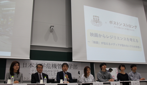 ![]() 爆破事件当時ボストンいた李氏は、新聞やテレビで流れていたテロのニュースを見て 李さん:主人公のジェフ・ボーマンは、カルロスがジェフを助けなければ死んでいただろう。またボストンではスポーツがコミュニティの中心となっている。ジェフがシンボルとしてメディアに出たことで、勇気をもらった人はたくさんいました。 と話し、金教授は被害者への補償という観点で 金教授:この映画は、被害者やその家族へのメンタルケアなど、今後世界に通用する課題が描かれている。 と指摘。 安部川教授:テロや災害のトラウマから社会復帰して立ち直るのは簡単なことではない。テロの狙いは人殺しだけでなく、また次もあるぞ!と人間の心理を狙っている。でもそれに負けてはいけない。この映画はそのための力、乗り越える力をくれる。 と続けた。 「東京オリンピックを控える日本もテロの脅威に備えなければならないのではないか」 「日本人がもし海外でテロにあってしまった時、また逆に外国人が日本でテロにあってしまった場合の補償はどうなるのか」 「映画の主人公のように、メディアに出て有名になることで、テロの標的にされないのか」 などの質問が投げかけられ、今後テロに対してどう向き合い、対処していくべきか、真剣な眼差しの生徒たちと教授陣らのディスカッションが繰り広げられ、映画を通してテロとその被害者をより身近な出来事として認識し学んだトークイベントとなった。 |