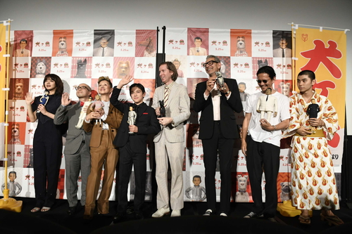 全員がステージに揃うと、ウェスは続けて、 ウェス・アンダーソン監督:この物語の舞台となっているのは外国人である僕の想像した理想郷ともいえる、ウニ県という仮想の街。この映画の製作が始まった最初の日から思い描いていたのは、こうやって日本に来て、日本の観客のみなさんに僕が作った日本が舞台の映画を観てもらうことだった。それが今日なんだ。そして、この映画を一緒に作ったみんなと壇上でこの日を迎えられること、みんなにやっと映画を観てもらえることを本当に嬉しく思っているよ。 と明かしました。 |