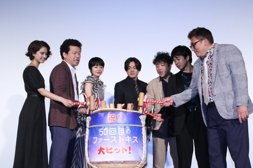 山田孝之さん:旅立つ気持ち嬉しくもあり。こうして皆で集まれる回数が減ると思うと寂しくもあります。 長澤まさみさん:ちゃんと福田組は初めて。仲間に入れてもらえたことが嬉しかったですし。早く見ていただきたくてこの日を楽しみにしていました。 福田雄一監督:本当にうれしいです!昨日、大賀といまして・・・舞台挨拶に名前のパネル嬉しいですよね。 ムロツヨシさん:無事10回目のファーストキスが(佐藤さん:タイトル違ってる!)50回目に来ていただいてありがとうございます。満足していただけた顔してますね。 大賀さんは先ほど見つけたファンに向かって挨拶! 大賀さん:去年の五月に撮影して本当に先輩方に仲良くしていただいて、楽しかったです。終わるのが寂しくてできればもう少しみんなといたいなと思っています。今日は頑張るんで。楽しんで。よろしくお願いいたします。 山崎紘菜さん:山崎さん:いかがでしたでしょうか。私にとってターニングポイントになる映画になりました。・・・皆さんにとっても・・・心に残る作品になったら嬉しいです。 一番の思い出は? 山田さん:・・・・毎日楽しかったので、一番は思い浮かばない! 山田さん:そうめん大量に買ってきて、ゆでていた僕のおかげでしょ! 佐藤さん:俺の時は、白のTシャツ?白の!!!なぜ後半落ち期はやってくれなかったの! と悲しがる佐藤さん。 大切な人とキスをしたくなる映画、理想のキスは? 山田さん:理想のキスは・・ハワイでたくさんしました。映画では博物館の奴。 耳もとでささやかれる言葉は映画館で確かめてみて。 監督:パイナップル畑のシーン。風が強くて何度も撮って。山田に謝ったら「これはこれで良かったです」と。格好良かった! 佐藤さん:長澤まさみとキスしてきたって!嬉しそうに帰ってきたときね。 と、山田さんキスシーンを楽しんでいたそう。一方、長澤さんは、 ムロさん:食い気味な奴? ムロさん:OKできる! となぜかキスする気満々のムロさん。 そして、ここで公開記念鏡開きに! |