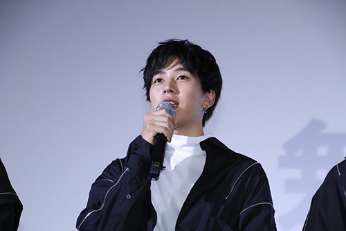 桜田さん:EVENボーカル・武人役の桜田通です。初日にお集まりいただきありがとうございます! 栗原さん:ギター・涼役の栗原吾郎です。今日はよろしくお願いします! 才川さん:ベース・充役の才川コージです。今日はお集まりいただきありがとうございます! 坂東さん:サイドギター・快役の坂東龍汰です!今日は映画楽しんでください! 櫻井さん:ドラム・春雄役の櫻井圭佑です!本日は今日はよろしくお願いします! 岡野さん:マミ役を演じた岡野真也です。今日はよろしくお願いします! との挨拶からイベントはスタート。 |