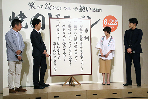 映画『焼肉ドラゴン』の大ヒットを参加者全員で祈祷後に、昭和45年の高度経済成長期という大きな時代の波に翻弄されながら、その片隅で強く逞しく生きる家族の絆が描かれることにちなみ、『焼肉ドラゴン』一家の“家訓”を発表、大泉節全開となりました! 映画『焼肉ドラゴン』大ヒット祈願イベント |