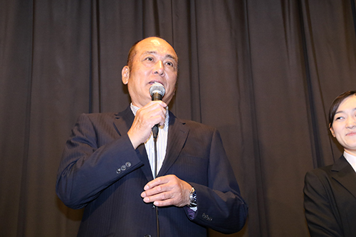 竹島さん:私の役は“フィクションでしょう”と思われがちですが、実在しています。現在は素敵な女性なのですが、当時は眉間のシワがすごかったようです(笑)女性同士の喧嘩のシーンは、どんな言葉を実際に使っていたのか本人に聞いてみました。『テメー、コノヤロー、かかってこいよ』などは、本人から教えていただいたセリフを使わせていただきました。 伊藤さん:映画の中で住職の妻を演じました。“いかに怖い思いをしたか”を忠実に再現できたらと思い演じました。今日初日を迎え、本当にこのように皆さんに観ていただける日がきたと思うと、お客さんを前に感動しています。今回、私は怒ってばかりの役でした。実在した方は、とても綺麗な女性だったと伺っていたので、演じる上でその点ではプレッシャーでした。 と語りました。大柄で、強面の伊吹さんは 伊吹さん:文句ばっかり言って逃げまくっている男の役をやらせていただきました。“きたない男だなあ”と思われたのではないかと思います。殉職した身辺警備員がいるので、亡くなられた隊員のお父さんとお母さんが息子と対面するシーンは、台本を読んでいるときからジーンときていました。自分が演じろと言われたら自分はできないのではないかと思いました。 |