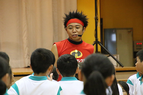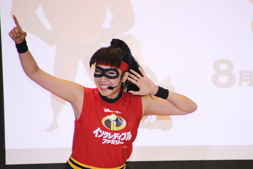 小学生約100人が体育館に集められ、先ずは予告編を鑑賞! 皆『インクレディブル・ファミリー』観たいですか!!とのMCの問いかけに はーい!と生徒の皆さん元気よく返事! そして、今日は特別事業で『インクレ・ヒーロー・ダンス』を踊ることに! 森奥愛先生がダンスのレクチャー!