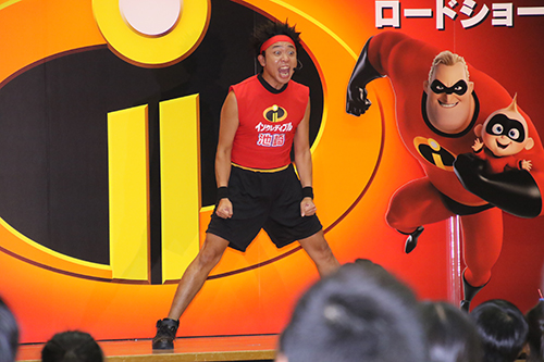 イエ――――――イ!池崎さんの声が!知らされていなかった生徒さんたちはざわざわ! そして、体育館に現れると歓声が! 池崎さん:イエ―――――イ!今日はサンシャイン池崎じゃないですよ!サンシャイン改め 池崎さんは今回声優も挑戦。これに関して聞かれると 池崎さん:もともとミスタ―インクレディブルが好きだったんで!メチャメチャ嬉しくて楽しかったです! と回答! ここで本日のメインイベント、池崎さんと『インクレ・ヒーロー・ダンス』を踊ることに! 池崎さん:サイコーいいね!みんな元気!サイコー |