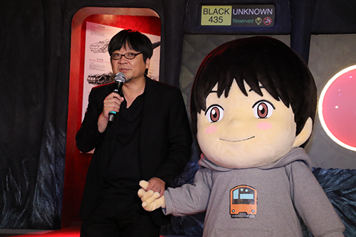 そして!明日7月25日(水)より、“未来のミライ展~時を越える細田守の世界『時をかける少女』『サマーウォーズ』『おおかみこどもの雨と雪』『バケモノの子』”が東京ドームシティ Gallery AaMo(ギャラリー アーモ)にて開催となります。 開会式には、主催者の皆さんの他、細田守監督とくんちゃん(着ぐるみ)が登場! 更に『未来のミライ』の主人公くんちゃんが電車好き&劇中や本展で、「黒い新幹線」が登場することから、オフィシャルサポーターの就任が決まったメインダンサー&ボーカルグループ「超特急」が6名揃って登場し、展示された「黒い新幹線」をバックにテープカットを行うなど展示会のスタートを祝いました。 場所:東京ドームシティGallery AaMo(文京区後楽1-3-61) |