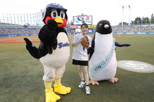 始球式前には、東京ヤクルトスワローズの人気マスコットキャラクター・つば九郎と、映画『ペンギン・ハイウェイ』のマスコットキャラクター・アデリーペンギンが登場!