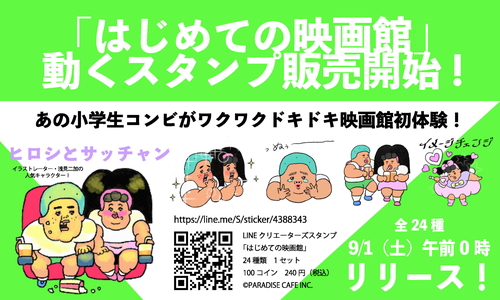 クリエイターズスタンプで熱狂的なファンを持つキャラクター「ヒロシ」と「サッチャン」が映画原体験をする「はじめての映画館」。 「映画って人生を豊かにするから素晴らしい!映画業界を多方面から盛り上げたい!ヒロシやサッチャンみたいに映画でワクワクどきどきする映画原体験をたくさんの人(子どもも大人も!)に経験して欲しい!」 そんな熱い想いで、映画制作の傍ら実現した企画です。 「はじめての映画館」〜こんなLINEスタンプ〜 素朴で元気な小学生(!)の二人が映画を観に映画館へ行くことに。 前の晩から楽しみで仕方がなかったヒロシは少々寝不足の様子。 ・カテゴリー:アニメーションスタンプ ©PARADISE CAFE INC. イラストレーター・浅見二加 |