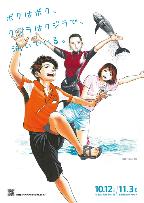 ポスターは、「太地町立くじらの博物館」の自然プールをバックに、鯨井太一(矢野聖人)×白石唯(武田梨奈)×間柴望美(岡本玲)が、同じ夢に向かう仲間として、トレーナーの姿で笑顔をみせているのが印象的。 間の眼差し、アイドルグループ「虹のコンキスタドール」メンバー清水理子が歌う主題歌「Colorful 〜あなたといた時間〜」の楽曲にのせて、青空の中、自転車で駆け抜けていく清々しい3人など注目すべきシーン満載です。 そしてチラシは、「ゴリラーマン」「BECK」などで人気を博している漫画家“ハロルド作石”氏の描き下ろしイラストも登場! |
