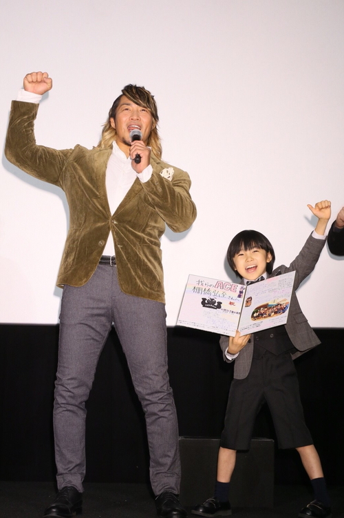 棚橋さん:みなさんいかがでしたか? と尋ねると、会場からは大きな拍手で返され、 棚橋さん:これで安心して進められます。(笑) と笑顔で一言。満員の劇場をみて、藤村監督も感無量の様子。 9月22日の今日は、本作の最初の打ち合わせから493日目。500日近くこの映画に向き合ってきて本日の舞台を迎えた今の気持ちを聞かれると、 棚橋さん:ハレの舞台。プロレスラーになってから、こんなに大きな劇場で、こんなに多くのみなさんの前で舞台挨拶することになると思ってなかったので嬉しいです。僕監督に聞いてみたかったのですが、初めての打ち合わせのとき、本当に『棚橋でいける!』と思ってくれたのかなって・・・。 と恐る恐る監督に質問し、 棚橋さん:初めにお会いしたときは、棚橋さんと、一緒にやることは本当に決めていました。最初はどんな方かわからなかったので、不安だったんですが、お会いして、棚橋さんの覚悟をすごく感じたんです。僕も初めてで、棚橋さんも今回初主演できっとそうとうプレッシャーもあったと思いますが、そこに立ち向かっていく意思をすごく感じて、きっとそれが映画にも反映されていると思います。 と、初対面から棚橋の強さと覚悟を感じたという想いを明かす。 座長として気を付けたことについて聞かれ 棚橋さん:木村さんや寺田さんに演技の面ですごく助けられたので、スタッフさんやエキストラさんに積極的に声をかけたり、いい雰囲気で撮影できるように座長として勤めていました。 と座長としての立ち回りでの心がけを語った。 そんな座長・棚橋さんについて、 木村さん:棚橋さんは、とっても強そうですが、すごく可愛らしい一面もあるんです。差し入れのスイーツに飛びついたり。甘いものを嬉しそうにみて写真を撮ったりして、女子力が高いな~と(笑) こんなに男らしいのに、『でもあんまり食べたら太っちゃうな』とか悩んでる姿がとってもかわいらしいなと思ってみていました。 と、意外な一面があったことを語りました。 心くん:棚橋さんはたくさん遊んでくださりました。プロレスごっこしたり。 と明かすと、当時よくやっていた“オカダカズチカのレインメーカーをよけて棚橋に一撃する”という遊びを二人で実演し、和気あいあいとした撮影現場だったことを感じさせた。 心くん:思い出がつまっている毎日でした。毎日ワクワクがいっぱいでした。毎日撮影が楽しみだなと思っていました。 と話し、撮影が楽しいものだったと明かした。 今回の主題歌を担当した高橋は、映像を観て、何度も曲を書いたそうで、 高橋さん:何度もみて、その都度新しい発見があって、大好きな映画になりました。プロレスのシーンを観ているとかっこいい男の人の背中、というような曲もいいなと思ったのですが、人のあたったかさが伝わってくる映画だなと思ったので、そういう方向で曲をつくっていきました。 と曲作りの裏話を語った。 このプロモーションのため、100媒体を超える取材を一人で背負ってきた棚橋さんは、まさに“100媒体を背負う逸材”。 棚橋さん:やっぱり繰り返し情報を発信していかないと、映画があるということが伝わらない。なので、いろんな角度からみなさんに少しでも届けられるようにがんばりました。 と話し、座長ということに対するプレッシャーもあったからでは?と聞かれると、 棚橋さん:すごくプレッシャーを感じていました。一ミリもみせませんでしたけど。(笑) と本音を暴露した。 |