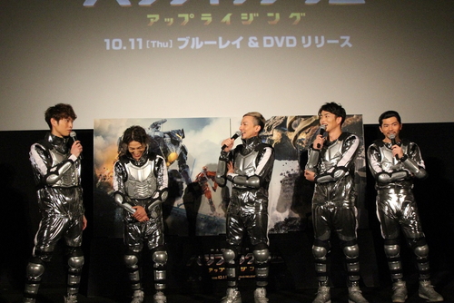 親子ペア応援上映会に、DA PUMPの7名がサプライズゲストとして登壇した。 MC からサプライズゲストして紹介された DA PUMP は、劇中に登場する巨大人型戦闘兵器“イェーガー”に乗り込むパイロットを イメージした衣装で登場。 早速、話題の楽曲「U.S.A.」を披露すると、会場は大盛り上がり!!!!