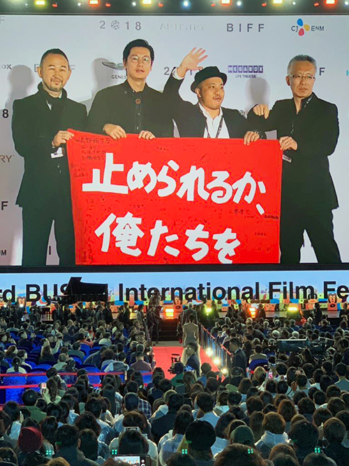 レッドカーペットで、白石和彌監督と井浦新さんもが真っ赤な、「止められるか、俺たちは」という文字だけではない。よく見ると、た くさんのサインが書いてある旗を掲げて登場! 当然会場の大画面にも! 白石監督:やっぱり若松さんに見せたかったな と一言。これには映画の中で若松孝二監督を演じた井浦新さんも頷いていた。 |
