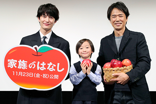 そして拓也の子供時代を演じた田中レイ君が映画にちなんで、かごいっぱいのリンゴをもってサプライズ登場! 会場は完成と共に温かい空気に包まれ、レイ君に目線を合わせ 岡田さん:楽しく過ごせたよね! と撮影を振り返り、レイ君に 岡田さん:僕の年齢、何歳に見えるんだっけ? と質問すると、 レイ君:19才! と答え、 岡田さん:まだ高校生役できる! と笑顔。それを見ていただいた時任さんにはなんと レイ君:15才! と答え、 時任さん:ありがとう! と満面の笑みだった。こうしてにぎやかでありながらも、終始温かい空気に包まれたまま親子試写会は幕を閉じた |
