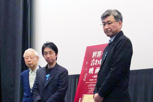 上映後の舞台挨拶では、佐藤広一監督、本作に語り手の一人として登場した佐藤良広、 「世界一の映画館と日本一のフ ランス料理店を山形県酒田につくった男はなぜ忘れ去られたのか」の著者・岡田芳郎が登壇しました。 佐藤監督は深々と頭を下げ、 佐藤監督:大杉漣さんもこの日を喜んでくださっていると思います。 と笑顔で語った。 佐藤監督:大杉漣さんとは自分が 20 代の頃に短編映画にスタッフで参加し、主演を務められていた大杉さんとお知り合いになる機会があった。この映画のナレーションには、大杉さんしかいないと思いました。お願いしたところ即答でご快諾い ただき、大杉さんのナレーションで血が通った作品になりました。 と大杉漣さんとの思い出を鮮明に語った。 山形で映画サークルの活動をしている佐藤良広さんは 佐藤さん:映画を観なくても生きていける。でも映画が生活の中にあると 人生が豊かになります。この映画もそんな作品になっていると思います! と絶賛。岡田芳郎さんは自らの著作と本作について語り、 岡田さん:このような映画ができたことがとても嬉しい。次は佐藤監督にグリ ーン・ハウスの元支配人を主人公にした劇映画を撮ってほしいですね。 と次回作を提案。 佐藤監督:がんばります! と笑顔を見せ、笑いと拍手をあびました。 |