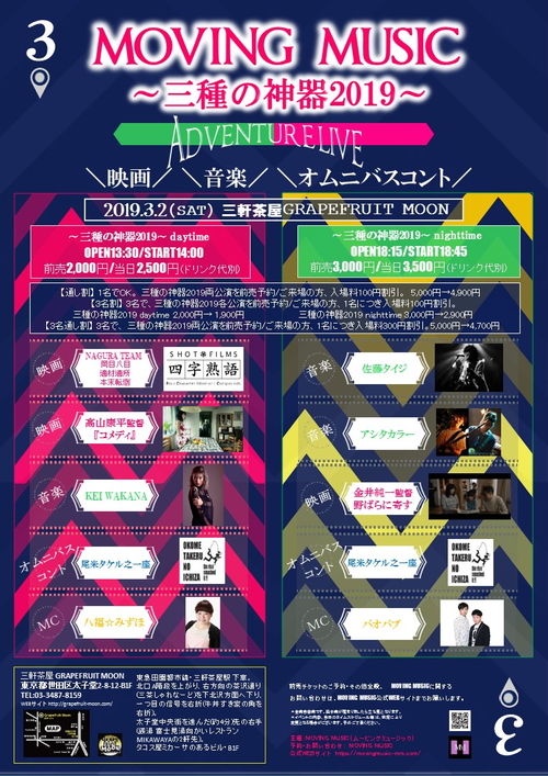 『MOVING MUSIC ~三種の神器~』は、異種多様の表現のジャンルを『神器』と銘打ち、「MOVING MUSIC」でなければ聴かれない観られない、“MM三種の神器”を1つの空間に結集しお贈りするアドベンチャーライブイベントです。