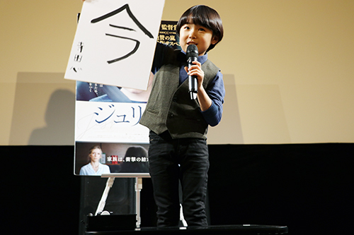 そこで心くんが書いた一文字は“今”。 心くん:過去と未来の境という意味。その時その時の“今”を大事に、一生懸命頑張りたいという意味です! 10歳とは思えない、しっかりとした受け答えに客席からは自然と拍手が起きました。 その後は、イベント前に予め半紙に書いていた“ジュリアン”の文字を持ってフォトセッション。身長ほどの長さがある“ジュリアン”の文字を持って、しっかり映画のPRをしてくれました。 |