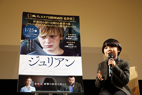 繊細な人間ドラマでありながら、張り詰めた緊張感が観る者を襲う傑作サスペンスとして注目されている本作は、夫によるDVが原因で離婚したミリアムと息子ジュリアンを執拗に追いかける元夫アントワーヌの様に“ホラー映画よりも怖い”といった感想が多く聞かれている注目作。MCが「ちょっと心くんには難しい内容かもしれないけどどうでした?」と話すと、![]() 心くん:お父さんとお母さんはきっと初めは大好きだったと思うけど、好きっていう感情の方向を間違えると、こんなにも怖くて悲しくなるんだなと思いました。 と大人顔負けの感想を述べ、観客からは「すごい…」という感想が漏れていました。 |