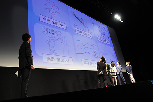 また、フィンランドでのシーンが絵画のように映えていたことにちなみ、出演者が思い出に残ったシーンをイラストにして発表。![]() フィンランドのサンタ村に行った登坂の絵を見た瞬間 中条さん:登坂さんの絵がひどい。 と言い出すと、 浜野さん:なにそれ、犬小屋?サンタの小屋? と突っ込む一幕も。中条さんが描いた悠輔が作ったガラス玉を絵には、出演者一同から口々に、「ドラゴンボール?梅干し?」など総突っ込みが入り、それを見た 登坂さん:うまいな。うまい。 とフォロー。 また高岡さんは美雪が幼い頃から大切にしていた ヒツジのぬいぐるみという映画愛に溢れた絵を描き、橋本監督は嬉しそうな表情でうなづいていた。さらに「ぷりぷりしている悠輔」を描いた浜野さんの絵には、会場から笑いが起こり、満を持して披露した田辺画伯は、青、 緑の波線三本でオーロラを表現しつつ、カタカナでフィンランドと書いた絵を見せると、それを見て 登坂さん:ずるい!!!それだったらサンタって文字で書けばよかった。 |