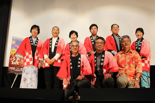揺らがぬ信念がもたらす希望の未来! 演奏後、双葉町の人々、中江監督から一言ずつもらうことに。避難区域に住んでおり、周りに気を遣って現在は思い切り唄を唄えないという唄い手の伊藤 さんは「まだ気を遣っていますが、本気出すと今よりもっと良い声でますよ!こ れからも頑張っていきたいと思います」と元気よく述べ、伊藤さんの夫・吉夫さ んは「先月、双葉町に行ってきましたが、以前住んでいた家にイノシシが住ん でおり、何をしに来たんだという目をされました(笑)」と現状を笑いに変えなが らも、「4 年後には避難指示が解除されるかと思いますので、それまで今日の ことを思い出し、頑張りたいと思います」と力強く語った。笛を担当した木幡親 子の息子・昌也さんは「1 年に 1 回しか吹けないのが現状。そんな中今日こ んな素晴らしい場所で笛を吹けたのは一生の思い出ですし、これからも頑張 ろうと思います」と父・春夫さんと笑い合った。横山さんの幼なじみであり、「盆唄」存続のために横山さん二人三脚で活動して いる太鼓担当の今泉春雄さんは「感激しかありません。久しぶりに会う同級生もいっぱい観に来てくれて・・・一生懸命踊ってく れて本当に嬉しかったです。ありがとうございます」と胸がいっぱいの様子。 最後に、双葉町の横山さんは「『盆唄』に出ることを決めた大きな理由は、「双葉盆唄」を後世に残したいと強く思ったから。双葉町の住民が歳を取っ て帰れなくなっても、ハワイへ託し、いつか双葉町に帰れた人々に伝えて欲 しいと思いました。そしてもう一つは、きちんとした双葉の各地域の盆踊りを映 像に残したかったから。監督にお願いすると、8カメラも用意して快く撮影して くださったんです。感謝しかありません。この映画に関われたことで、大きな目 的2つが達成できました」と感謝の気持ちを述べた。そして「これからどうなる か分からない。けれど腕を振るう間、双葉の盆踊りは絶対に消滅させませ ん。私たちがいなくなっても、必ず復活させる段取りをこれからもしていきたい と思っています!みなさん本当にありがとうございました!」と力強い言葉に、今日盛大な拍手がわき起こった。 それを聞いたかんとくは、「今振り返ると、豊かな時を過ごせたなと思います。今日観てもらったら分かるとおり、双葉町の 人々は辛い顔をされているでなく、前向きに生きている。僕はそれに勇気をもらい、この映画を希望のもてる映画にしなけれ ばいけないと強く想い完成させました。『盆唄』が全国、そして世界に広がることが双葉町の現状をつたえるだけでなく、日本 人の力強さを伝えて行くと思います。みなさんこれからも応援よろしくお願いします!」とメッセージを残し、感動の舞台挨拶 が終了した。 |
