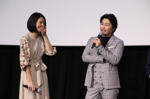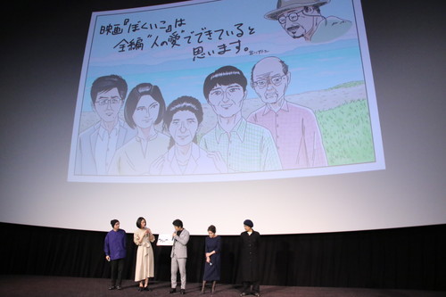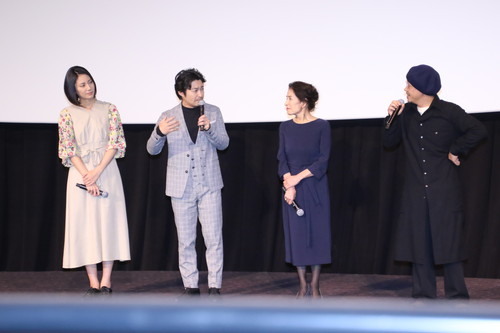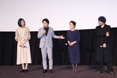 安田さん:映画をご覧くださりありがとうございます。え~、泣いていらっしゃいますね。でも、こうして生きていらっしゃいますし。 安田さん:こんな立派な映画館だと思わなかった~。もっとこじんまりしたところだと。油断してました。チョット大きすぎて。超大作みたいです。ありがとうございます。 倍賞さん:小さいとこって聞いてたので・・・こんな大きなところと思わなかったです。(MC:満員でございます。(拍手))凄く嬉しいです! 松下さん:こんな大きな会場だとは、ステージもじゅうたんでフワフワですし。皆に愛していただいてるのだなと実感しました。 大森監督:こんなに大きいとは。。。現場のイメージですかね。こじんまり撮影してたので・・・映画製作に結構時間がかかりまして。こうして皆さんの前でこうして舞台挨拶嬉しく思っています。安田君と楽屋で話していたのですが、PRに「笑って、泣けて、」もう一個、欲しいんですよね。って。 安田さん:昨日、本作を観に行った奥さんに言われたんです。「あなたいろんなとこで宣伝してたけど、PRコメントちょっと弱い。と言われて、あったかい気持ちになって、前向きに慣れる自分がいましたって。それだけだとちょっと弱い。」と、なので、考えました。ちょっと背中を押してもらえる、スッと前に進める映画だと。 大森監督:笑って、泣けて、もう一個何かつけるとしたら。皆さんで良いフレーズを付けて拡散してください! と、観客に向けてお願いモード。 |