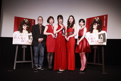 本作を一早く鑑賞するチャンス掴んだ観客が今 か今かと待ちわびる満員の会場の中、ホラーの巨匠 中田秀夫監督が登壇し、続いて主演の主人格で、ギャルソンのキョウコを演 じた飛鳥凛さん、キョウコの内に潜む別人格をそれぞれに演じた、大島正華さん、 松山愛里さん、中谷仁美さん らが、本作のキーアイテムでもある、真っ赤なワイ ンと鮮血をイメージしたセクシーで挑発的なドレスを身に纏い登壇。