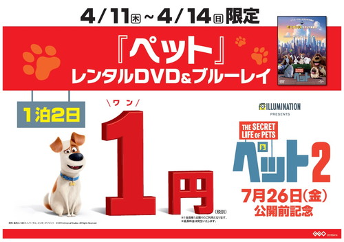 【4.11(木)ペットの日記念「『ペット』1(ワン)円キャンペーン」概要】 ■キャンペーン期間:2019年4月11日(木)~2019年4月14日(日) ■実施店舗:全国のゲオショップ、レンタル映像取り扱い約1,200店舗 ■キャンペーン内容:①『ペット』レンタルDVD・ブルーレイが期間中1泊2日1円(※3) ②対象作品を2本以上同時レンタルで「ペット2」スペシャルシールを配布(※4) ■対象タイトル:①DVD・ブルーレイ「ペット」 ②DVD・ブルーレイ 「ペット」、「SING/シング」、「イースターラビットのキャンディ工場」、「ロラックスおじさんの秘密の種」、「ミニオンズ」、 「怪盗グルーの月泥棒」、「怪盗グルーのミニオン危機一髪」、「怪盗グルーのミニオン大脱走」、 「ミニオンズ9ミニ・ムービー・コレクション」 ■レンタル料金:①1円(税抜) ②通常レンタル料金 ■レンタル泊数:①1泊2日(※5) ②通常レンタル泊数 ※1:一部実施しない店舗がございます。詳細は各店舗にて確認してください |