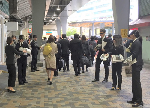 ブラック・スーツ&サングラス姿の男女数十人が丸ノ内・有楽町・新宿に突如出現し、新生活に少しずつ慣れ始めた平成最後の新入社員たちにむけた「私たちほどの、“ホワイト企業”はありません。」のメッセージとともに、様々な仕事内容・社風がズラリと紹介された特報記事が配布された! 「Hello, MEN IN BLACK. Thank you!!」「MIBからお知らせです!」と国際色豊かなスーツ&サングラス集団によって次々に記事が配られるとその熱気にオフィス街が騒然となるなか、出勤途中のサラリーマンを中心に有楽町では6000部が手渡されました。 ぜひエントリーして自身の眼と体で確かめて欲しい。 |
