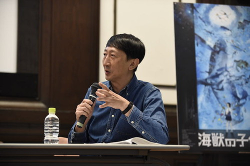 ■「海獣の子供」原作や映画を見た感想![]() 田島博士:研究者としてはムムッと思うような、実際とは異なる生き物たちの表現もありますが(笑)、漫画や映画だからこそ好奇心が沸きたてられるファンタジー性と同時に、生き物や自然史の本質を描かれていたので、我々研究者と志は同じなのかなと感じました。「私たちはまだ世界のほんの一部しか知らない」という映画全体のコンセプトは、我々も研究する上で、分かっていることばかりではない、自然の一部しか見ていない、と常に思いながらやっているので、それが伝わってきて心地よかったです。 ■「海獣の子供」という題材について ■シンボルとして描かれているザトウクジラについて 渡辺監督:海獣たちの描写は、実物を何度も見て佇まいや動きを突き詰め、それらしい誇張を表現するよう努めました。あえて実物のクジラのサイズよりも大きく、胸ビレも長く描くことで、よりダイナミックになるように仕上げました。映画の中のクジラの<ソング>は本物のクジラの声をベースにしながら、映画的な演出を加えて作っていきました。 田島博士: 実はクジラにも視力があり、太陽光が照る水面から30mほどの場所やブリーチング、スパイホップ時にはその視力を発揮します。劇中でも印象的な、クジラがグッと見つめる目の描写は迫力があり、実際のクジラにも見られる動作なので、よくお調べになっているなと思いました。シルエットなどを意図して誇張されている分、迫力があり訴えたいものが伝わってくるのがアニメーションの魅力ですね。クジラの<ソング>には毎年流行があります。誰が流行を作るのか詳細は分かっていませんが、彼らの中でルールがあるようで、地域によって方言のようなものが存在することも分かっています。ザトウクジラはとても優しくて、シャチに狙われているアザラシを助けたりするんです。そういうことをするのは、我々の研究ではザトウクジラだけです。 ■映画製作にあたり意識したこと |