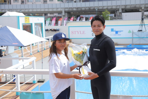 また、主演の吉沢さんには、2018年世界ジュニア選手権日本代表、2019年日本代表強化指定選手であります、16歳の天才サーファー・脇田紗良(さら)選手より、激励の花束贈呈もありました。 |