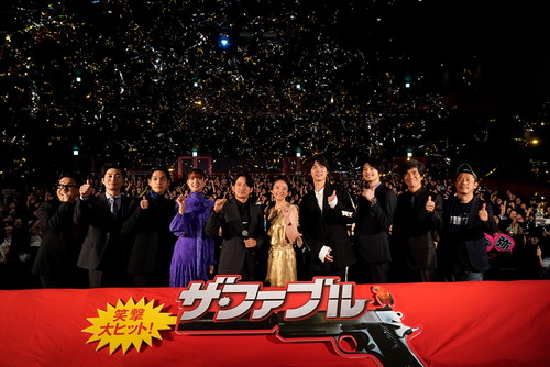「今までに無かった殺し屋エンターテインメントになっている」 と“岡田准一ファブル”を絶賛するコメントに、 岡田さん:原作の先生が喜んでくださっていてすごく嬉しい。 と笑顔を見せた。 続いて、制作スタッフから本作とゆかりのある贈り物が到着。 イベントの後半には、岡田さんからこれから映画を観るファンにメッセージ 岡田さん:この映画は、笑ってスカッとできる、だれもがスッキリできる映画です。アクションの検証も含めて、ぜひまた何度でも観にきてください! 最後は、岡田の「ザ!」の掛け声に会場全体が「ファブル―!」と答える形でコール&レスポンスが行われ、顔の前に親指をかざすジャッカル富岡の“ジャッカル”ポーズをとりながら、観客をバックに記念撮影を行いました。 |