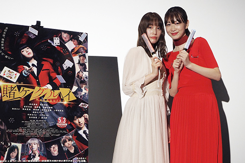 6月15日に実施された『映画 賭ケグルイ』の応援上映舞台挨拶が好評につき、第二回目が、同じく吉祥寺オデヲンで開催された。浜辺美波演じる蛇喰夢子(じゃばみゆめこ)らと敵対する生徒会メンバーとして、ドラマseason1から作品に参加する五十嵐清華(いがらしさやか)役の中村ゆりかさん、西洞院百合子(にしのとういんゆりこ)役の岡本夏美さんが応援ゲストとして登壇!今だから話せる撮影秘話などエピソードトークを披露しました。
