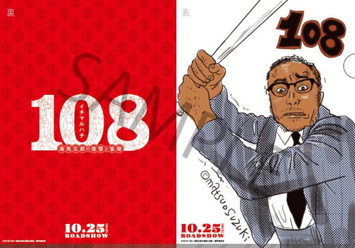 クリアファイルの表面に描かれているのは松尾がこの特典のためだけに描き下ろしたオリジナルイラストで、主人公・海馬五郎がただならぬ形相でバットを振りかざす姿が描かれています。妻の浮気投稿に激怒した海馬は、果たして前代未聞の復讐計画を貫徹できるのか!? 『108~海馬五郎の復讐と冒険~』 |