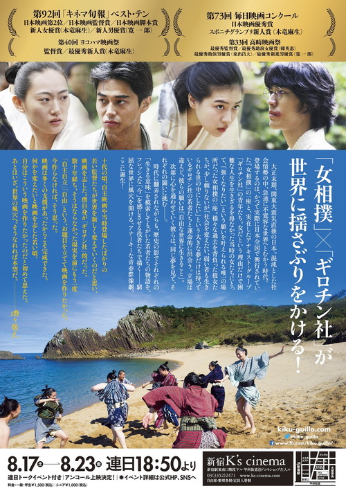 『64 -ロクヨン- 前編/後編』の鬼才・瀬々敬久監督が、2010年発表の傑作『ヘヴンズ ストーリー』に続き、8年ぶりに放った自身の企画によるオリジナル映画『菊とギロチン』が、昨年、新宿テアトルを皮切りに全国で公開され、大きな話題となりました。また今年の春には第92回キネマ旬報ベストテンで日本映画監督賞をはじめとした5部門での受賞や、第73回毎日映画コンクール、第40回ヨコハマ映画祭、第33回高崎映画祭など、数々の映画賞で受賞に輝きました。 本作の公開から1年が経ち、この度K’s cinemaにて、新宿での凱旋上映【8/17(土)-23(金)】が決定しました。 K’s cinemaでは、今後毎年、夏は「菊とギロチン」の上映を予定しているとのことです。今回の凱旋上映期間中は、連日、上映後に出演キャストや、スタッフなどトークイベントも開催予定。詳細は決まり次第、劇場HP、作品HP、作品SNS等にて随時発表されます。 |