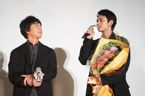 ここでイベント当日の10月31日から2日後の11月2日、3日、4日と奇跡の三連続で誕生日を迎える滝藤、北村、尾野をサプライズで祝福するため「ハッピーバースデー」のBGMの中、山崎が3人に花束を渡すサプライズ演出がありました!![]() ![]() 突然のサプライズに驚きながらも滝藤は「もう43歳です、あと40年は俳優をやれると思うので(笑)ここにいるみなさんと新しい作品ができると嬉しいです。」と抱負を語ると、北村は「僕は22歳になるんですが、ロケバスの中でまさよしさんがギターあげるよって言われまして、誕生日を知っていてくれたんだなって思い、良いお兄ちゃんです。」とコメントし、それを受けて尾野は「私は38歳です、嬉しいです!サプライズが大好きです。ありがとうございます!」と感謝を述べました。 最後に篠原監督は「みなさんと映画を作れて良かったなと思います。山崎くんとは長編映画では23年ぶりのタッグでそして『月とキャベツ』の公開当時と同じテアトル新宿で公開することができたことは凄く奇跡的で、ジャンルは違いますけど『月とキャベツ』と『影踏み』には何か縁があると思っています。本作は映画館で見る良さがある映画なので、みなさんにこの映画を広めてもらって、また公開したら見にきて欲しいです。」と本作に対する思いを述べ、山崎は「私自身デビューしてから25周年目に入りまして、今回素晴らしい共演者、そして昔から付き合いのある篠原監督、そして主題歌・劇判も作らせてもらいまして、映画に沿った良い主題歌が書けたと思っています。アニバーサリーで良い作品と関われて感謝していますしとても光栄です。」と本作への感謝を伝えイベントは終了しました。 |