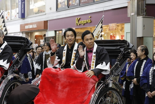 イベント開始間際になると一気に人が集まりだし、今か今かと待ちわびた観客が詰めかけ、アーケード街は一時騒然とした雰囲気に!大勢の観客が見守る中、人力車の前列に堤・岡村が、後列に中村義洋監督・池田史嗣プロデューサーが乗り込み、新京極商店街の交差点をスタートした。