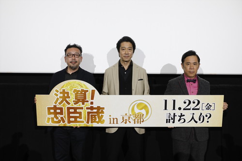 と感想を述べ、続いて 岡村さん:堤さんが『なんでこんなに男同士密着して・・別に隣に座ってるのが竹内結子さんでも石原さとみさんでもええのにな・・』とブツブツ言ってました。 中村監督:商店街のみなさんは暖かい恰好をされてますが、僕らは京都駅からタクシーで着いてすぐ、薄着の上に法被を着せられて外に放り出されて・・寒かったです。 岡村さん:ホッカイロは沢山もらいましたよ。 とフォローを入れた。 堤さん:商店街のみなさんに手をふっていただいて、とても暖かかったです。 と続けた。京都での思い出を尋ねられると、 堤さん:京都では何度も撮影をしていますが、おばんざいが美味しいですよね。大体どこのお店も美味しいし、お店の人もええ人やし。 と述べた。 岡村さん:大学が京都でしたので、1年だけ通ってました。ほとんど吉本の養成所とコンビニバイトの往復で、1回生の時は38単位くらいとれたんですけど、2回生のときは4単位しかとれなかったです。在籍は8年ほどさせていただいて・・・親父からは『金をドブに捨ててるようなもんや』と言われたんですけども・・・そんな京都に久しぶりにきて、撮影のときに美味しい所もたくさん連れて行っていただいて、堤さんともお食事も一緒にさせていただいて、とても楽しい時間を過ごさせていただきました。 中村監督:今まで地方でキャンペーンもしてきて、試写会の舞台挨拶もしたのですが、今日は有料上映だそうですね。金曜日から全国公開にはなりますが、京都で撮影もしてきた想いもありますので、僕は今日が初日だと思ってます。 と続けた。本作は大石内蔵助が書き残した預置候金銀請払帳を元にしているが、 中村監督:今でも明細破棄しちゃう人とか、捨てちゃう人とかいるのに、江戸時代から現代までこんなに残ってるんだと、昔の人はすごいんだなと心打たれました」としみじみ語った。 |