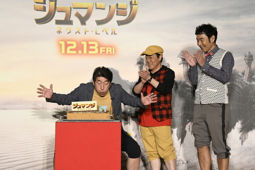 本日57歳の誕生日を迎えたジモンにサプライズケーキが登場し、本物のダチョウと共にマスコミ向けのフォトセッションを実施。 そして最後にMCから映画の感想を求められると、 ジモンさん:次から次にどんどん物語が展開される、素晴らしい映画に仕上がっています。本当に素晴らしい映画です。一足先に観させていただきましたが、本当にアドベンチャー!さすがゲームが絡んでいるだけあって、次々と予想できない展開が繰り広げられていきます。アクションとシチュエーション、そして動物たちが登場する、本当に夢のある作品なので、家族と一緒に観て欲しいと思います。 上島さん:とにかくアクションが凄いです!ダチョウはもちろんですが、色んな動物も出てきて、最後までワクワクドキドキでございます。ぜひスクリーンの大画面で観て欲しい! 肥後さん:ダチョウだけじゃなくて、マンドリルも出てきたり、とにかくスゴいです!最後までアクションシーンたっぷりなので、ぜひご覧ください。 とコメント。しっかり映画のPRをすることも忘れず、会場を後にした。