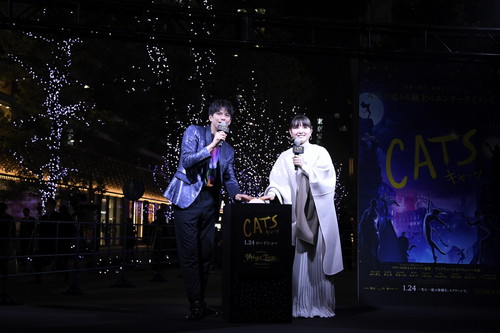 ロンドンのゴミ捨て場に捨てられた、若く臆病な子猫のヴィクトリアが、迷いこんだ不思議な世界で個性豊かな沢山の猫たちに出会い、自分らしく生きる事でキラキラ輝くことが出来る事を学んでいく姿が描かれていく本作。 本イルミネーションに最初に光を灯すために実施された”ジェリクル点灯式”イベントに、主人公ヴィクトリアの日本語吹替えを務めた葵わかなさんと、少し気弱だけれども優しい心を持つ魔法(マジック)猫のミストフェリーズ役を務めた森崎ウィンさんが登壇! 会場いっぱいに集まった大勢のマスコミ陣と観客の方々に拍手で迎えられると、 |