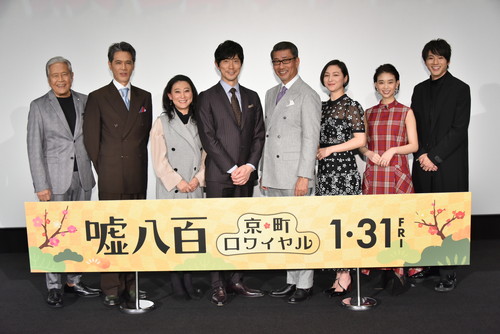 日本映画界が誇る中井貴一と佐々木蔵之介の黄金タッグ再びに、着物美人のマドンナ・広末涼子が華麗に参戦。前作を沸かせた超個性派ゴールドメンバーたちはもちろん、新たな敵:有名古美術店のやり手主人に加藤雅也、大御所鑑定家に竜雷太、人気の陶芸王子に山田裕貴をはじめ、今をときめく若手から味のあるベテランまで世代やジャンルを超えた豪華俳優陣が続々結集、息つく暇なく二転三転する、新春に相応しい、開運招福コメディが誕生しました! この度、1月20日(月)に本作の完成披露舞台挨拶を行い、中井貴一、佐々木蔵之介、広末涼子、友近、森川葵、山田裕貴、竜雷太、加藤雅也ら豪華なキャストが揃って登壇しました。 『嘘八百 京町ロワイヤル』完成披露舞台挨拶 |