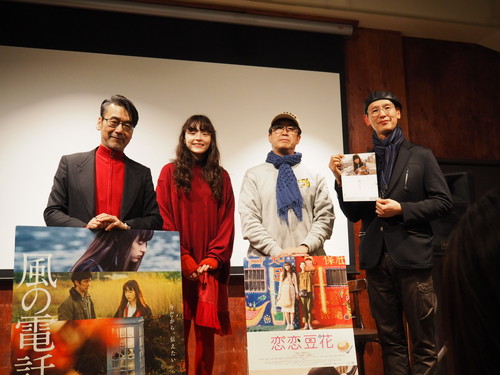 死別した従兄弟ともう一度話したいという思いから誕生したその電話は、「天国に繋がる電話」として人々に広まり、東日本大震災以降、3万人を超える人々が、この場所を訪れている。映画『風の電話』(公開中)は、この電話をモチーフにした初めての映像作品。現場の空気感まで切り取る諏訪敦彦監督ならではの手法によって、魂のこもった俳優たちの演技が胸を打つ感動作が誕生しました。 そして、台湾を舞台に描いたヒューマンドラマ『恋恋豆花』(2月22日公開)で監督を務めるのはベラルーシ、ウクライナ、モスクワなど世界を舞台に映画を撮り続けてきた今関あきよし。 この2作品の主演を務めるのは、今年注目の若手女優の中でダントツの個性を放つモトーラ世理奈。奇しくも1月、2月と連続して劇場公開されることを受け、諏訪敦彦監督(『風の電話』)、今関あきよし監督(『恋恋豆花』)による、モトーラ世理奈の魅力を中心に映画作りの世界を存分に語り合うイベントを行いました。 様々な年齢の男女がかけつけ、熱心に耳を傾けていました。それぞれの予告編を織り交ぜ行われたトークショーでは撮影中の本音トークも飛び出すなどして盛り上がりました。イベント後半には、モトーラ世理奈も参加し、両監督との撮影時の秘話も披露しました。 日時:2020年1月23日(火) |