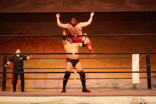 プロレスリングでの記者会見という前代未聞の光景。リングに立つことは中々ない機会に古川は「帝国ホテルの中でプロレスリング、このアンバランスさがすごくいいですよね。楽しみです!」と答え、三吉は「リング上でヒールを履いてると、本当に不安定で大変なんです、、早く脱ぎたい。ってほんと揺らさないでください!」と揺れるリングにあたふた。「僕じゃないよ!俺じゃないよ!」という言葉が飛び交い、ホラー映画を作り上げたチームとは思えないほど、和気あいあいとした空気が広がっていた。 続いて、全日本プロレスより三冠ヘビー級王座、宮原健斗選手がリングに入場。「地元が福岡で、実家から1時間以内のところに旧犬鳴トンネルがあるんです。本当に怖いし、今まで避けてきたのに、ここでまた対面することになるとは思ってなかったです。」と話し、清水監督に「完全に実家、呪いの範囲ですね」とホラー監督らしい一言。また、プロレスならではの怖かったエピソードを聞かれると「高所恐怖症なもので、リングの上から飛ぶときはずっとホラーです」といい、会場を盛り上げた。 そんな様子に清水監督からは「みんな、スタイリストさんに借りてる衣装には気を付けてね」と笑いを誘う場面も。宮原選手も坂東を徹底マークし、乱入するよう誘導するも、2m近くある石川を目の前に助けに入ることができず…。そんな石川は、ラリアットで犬鳴めんそーれと田村を決めにかかる。そんな中、大森の掛け声で、まさかの試合に主演女優が急遽乱入。 |