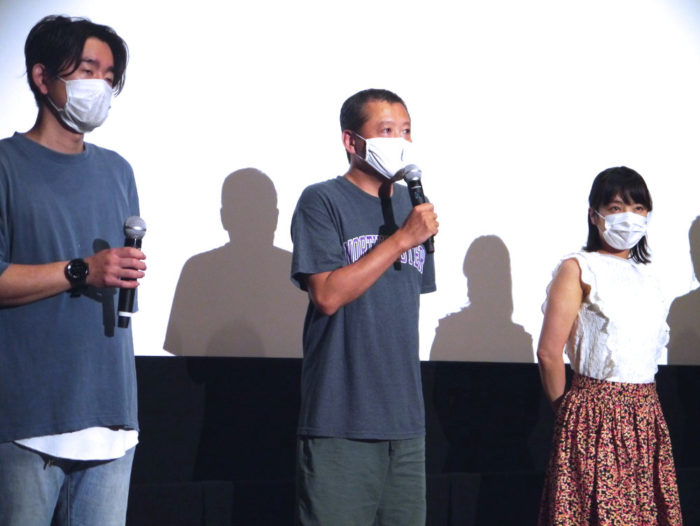 拍手の中、満員の劇場に登場した監督とキャスト。それぞれ公開初日を迎えことについて感謝の言葉を述べた。欠席となった主演・小林竜樹からは「こんな状況のなか、本日は劇場にお越し頂き、誠にありがとうございます!記憶を改ざんしてでも、忘れなくては生きていけない事、決して忘れてはいけないこと。『横須賀綺譚』が我々誰もが持っているそれらを、改めて考えるきっかけとなれていたら、幸いです。」とコメントが寄せられた。 大塚監督は、「元々はフィリップ・K・ディックの小説「地図にない町」が着想のもとで、震災をテーマに話を膨らませていきました。SFなのか、社会派ドラマなのか、リアリティドラマなのか、ジャンル分けが出来ない作品になったと思う。観客の皆さんのどう受け取られるか楽しみです」と5年越しの公開に感無量の様子。 また監督補を『カメラを止めるな!』の上田慎一郎監督が務めた本作。「なにかと衝突の多い現場だったので、撮影の合間に落ち込んでタバコを吸っていると、いつも彼が励ましてくれました。彼がいなかったらキャストに負けていたかもしれません」と苦笑しつつ振り返った。 演じた役柄について、ヒロイン役のしじみは、「亡くなったかもしれないと噂されるという役柄。普段から幽霊役が多いので雰囲気を活かして演じることが出来たと思います」と振り返った。 |