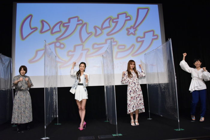 「“天使が舞い降りてきた!”と声をかけられたときはビックリしました!」 漫画家・鈴木由美子による大ヒットコミックを実写映画化した『いけいけ!バカオンナ~我が道を行け~』が、7月31日についに劇場公開された。同日には東京・飯田橋の神楽座で公開初日舞台挨拶が行われ、主演の文音、共演の石田ニコル、真魚、そして永田琴監督が出席した。 外ではイケイケ女を気取っているが、私生活では地味で質素な生活を送る“超”のつく見栄っ張りアラサー女子・杉山結子(文音)。そんな結子と美人の澤野セツコ(石田ニコル)、親友の中川絵美(真魚)たちの友情と恋愛模様を描くドタバタコメディ。 映画館ではなく、場所を変えて無観客で行われたこの日の舞台挨拶に文音は「映画館での舞台挨拶はできませんでしたが、このように形を変えて舞台挨拶が実施できたのは幸せに思っています。報道陣の方にもたくさん来ていただき、感謝の気持ちでいっぱいです」と感無量の表情だった。 映画の内容にちなんで“ナンパエピソード”を聞かれた文音は「32年間生きてきた中で、“天使が舞い降りてきた!”と声をかけられたときはビックリしました!」と衝撃的口説き文句を明かすと、ゲーマーで知られる石田は「私はナンパ以前の問題で人見知り。周囲に壁を作るのでナンパされる前に人の目を見ることができないんです。でもゲームか海の話だったら目を見て話すことができると思います(笑)」と違う意味で衝撃的な告白を披露した。 また理想の初デートを聞かれた文音は「お食事」、真魚は「映画」、石田は「老舗の焼き鳥屋さん」、永田監督は「焼き鳥屋さん」と回答。中でも石田は「焼き鳥は串から外さず、横から一気に食べてほしい」と食べ方へのこだわりを披露し、「私はパスタを啜る人が嫌いで、ズズズッってなると“うえ!”となる。なのでイタリアンに行くと、男性がパスタを食べるところを必ず待ちます!」とぶっちゃけ報道陣の笑いを誘った。一方の真魚は「チャーハンをすごい勢いで食べる人はいいなぁと思います。遠慮されるよりも、好きなものを好きなだけお腹いっぱい食べてくれる方が幸せになります!」と照れながら打ち明けていた。 自身の“バカオンナ”ぶりについて文音は「バカオンナとは、周りを気にせず一つのことに突っ走る。私もその一人です!」と宣言し、石田は「ゲームをやりすぎて、気づいたら10時間くらい経っていたら嬉しいですね。私バカだなぁって思います(笑)」とここでもぶっちゃけてくれた。真魚は「仕事も恋愛も一生懸命になると真っ直ぐになります。私もそういうところがありますね」と照れながら語ってくれると、永田監督も「私も仕事となれば、行くところまで行くなぁ」とそれぞれの“バカオンナ”を語った。 現在、新型コロナウイルスが世界的に猛威を振るっている。文音は「笑いは免疫力をアップするし、笑いはすべてを吹き飛ばします。マスクをしながら気をつけて笑って、元気になりましょう!」とエール。石田も「お互いに近づけない状況下ではあるけれど、SNSやゲームなど今は色々な繋がり方があります。いつか落ち着いたときに笑い合えるよう、今は一緒に踏ん張って頑張りましょう!」と明るい未来に期待。真魚は「身近な楽しいことに目を向けて、暗い気持ちだけではなく、この映画を見てもらって笑って、無理せずコロナと共存していきましょう」と呼びかけ、永田監督も「コロナと上手く共存して免疫をアップし、暗い気持ちにならいことが大事だと思います。ポジティブに明るく頑張っていきましょう」と力を込めた。 最後に主演の文音は、この日の公開に際して「今の時代に公開していいものかどうか悩んだけれど、笑うことで免疫力は上がるし、笑いは必要だと思います」と力を込めて「馬鹿正直に、ひたむきに走る女性たちの発するエネルギーがぶつかって生まれる笑いや、女の友情を描いた物語です。幸せとは自分で掴み取るものだと改めて思いました。“劇場に来てください!”とはなかなか言えない状況ですが、マスクをしながら笑ってスッキリしてもらえたら嬉しいです」と作品の広がりに期待を込めていた。 |