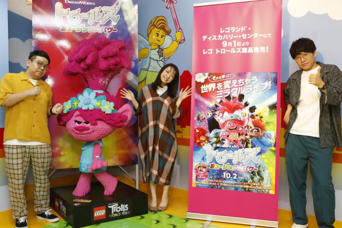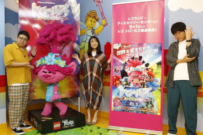 この度、『レゴランド®・ディスカバリー・センター東京』にレゴポピーのスタチューが登場!![]() ポピー役の上白石萌音さん&ミキ(昴生さん、亜生さん)がレゴランドに駆け付けました! ![]() 「ボス・ベイビー」などのドリームワークス・アニメーションが贈る未体験のミュージック・アドベンチャー『トロールズ ミュージック★パワー』が、お台場にある子ども達の遊びながら学ぶ楽しさ・創造力を刺激する、レゴ®ブロックをモチーフとした体験型アトラクション施設『レゴランド®・ディスカバリー・センター東京』とコラボレーションを果たし、レゴポピーのスタチューが製作されました!レゴポピーは29,061ブリックが使用されており、総重量は60kg。製作期間はおよそ6日間(147時間)をかけ完成。そのレゴポピーを一目見ようと、レゴランド®・ディスカバリー・センター東京にポピー役の上白石萌音さんと、トロール王国のひとつ「クラシック・トロール」の指揮者、トロールツァルト役のミキ・昂生さん、本作のストーリーテラー的な役割もあるクラウド・ガイ役のミキ・亜生さんが駆け付けました!上白石さんは「すごーい!髪の毛もすごい!(ハグタイムを知らせる)ポピーの時計もちゃんと作ってある!カワイイ~!」と細部まで再現されたキュートなレゴポピーに大興奮!ミキの昂生さんも「147時間ってなかなかな時間ですよ!」と膨大な製作時間に驚きをみせ、皆で盛り上がりました。 ![]() 一行はレゴランド®・ディスカバリー・センター東京内にあるクリエイティブワークショップへ移動。ここでは専属のレゴ職人、マスター・モデル・ビルダーが考案したスペシャルな作品を作るワークショップなどが開かれており、上白石さんとミキのお二人は、様々なレゴブロックの遊びも楽しみました。上白石さんは幼少期にレゴで遊んだ経験もあるようで、「私は同じアパートに幼馴染がいて、その子と一緒によく作っていました!男の子の幼馴染が多くて、おままごととかはあまりしてなかったんですけど、車とかロボットとか、その子が作っていたものを手伝っていました。」と、レゴとの思い出を振り返りました。皆さん童心に帰りながらも、頭の中のイメージを一から組み立てていると、少し手こずっていた上白石さんをみた亜生さんは、「萌音やん、めっちゃ不器用やん!レゴは子供でもできるのに!」と、お二人に突っ込まれながらも様々な制作を楽しんでいました。 昴生さん、亜生さんは「なかなかうちは子供のころレゴを買ってもらうような感じの家庭ではなかったので、ちょっとあこがれはありました。こうやってきちんとレゴブロックに触れ合うのが、僕らが声優をやらせてもらったトロールズきっかけというのはすごくうれしいですね」と話し、亜生さんは「レゴって、いくらでも楽しめる!ずーっと組み立てていられますね。こんなんずーっと遊んでしまうから、時間が何時間あっても足りない!」とレゴの魅力を話していました。 また、3人で『トロールズ ミュージック★パワー』の吹替えについて振り返り「とにかくミキのお二人の才能に驚きました。亜生さんは何度か声優のお仕事をされているだけあって本当に自然。この映画の冒頭は、なんと亜生さんの声から始まるんです。そこもぜひ注目してほしいです!」と話すと、亜生さんは「そうなんです、僕の才能が止まらない。僕の声から始まるこの映画は、ある意味僕の映画でもありますね(笑)」と声優の目線で話すと、すかさず昴生さんからは「いやいや、おまえ声優ちゃうで、恥ずかし!」と突っ込みが入り絶妙な掛け合いで周囲を笑わせてくれました。また昴生さんの吹替えについて上白石さんは、「本当にトロールツァルトというキャラクターになりきっているし、言われないと昴生さんってわからないくらい、ものすごく自然で上手いです!」と感想を言うと、昴生さんはうれしそうな表情をうかべ、「標準語に挑戦したのですが、お笑いやドラマ含めて、仕事で標準語にトライするのは初めての経験でした。とにかく吹き替え監督に怒られないようにしようと必死でした(笑)」と振り返り、ワークショップ内は終始笑いに包まれワークショップチャレンジは終了。プライベートでも仲の良い3人ですが、まるで兄妹のように和気あいあいと楽しみながらレゴランド®・ディスカバリー・センター東京を満喫しました。 |