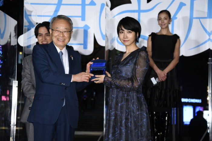 イベント終盤にさしかかると、本作がアニメーションの新たな聖地と評されたことを記念して、高野 豊島区長から聖地認定の「ときわ荘クリスタルオブジェ」が授与されました。![]() 代表して受け取った松本は「電車のラッピングなどもやっていただいて、公開に向けて池袋全体で盛り上げていただいてありがたいです。これからもよろしくお願いいたします!」とコメント。高野区長も「豊島区は昨年から中国と韓国と文化交流をしています。この2都市にこの作品を持っていきたいと思うほど、素晴らしい映画です!」とエールを送りました。 |